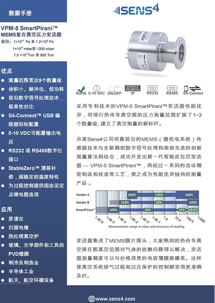 丹麦Sens4公司将最前沿的MEMS(微机电系统)传感器技术与全新精密数字信号处理构架和先进的创新测量算法相结合,成功开发出新一代智能皮拉尼变送器--- VPM-5 SmartPirani™,再经过一系列的自动精密制造和校准等工艺,使之成为性能优异独特的测量产品。